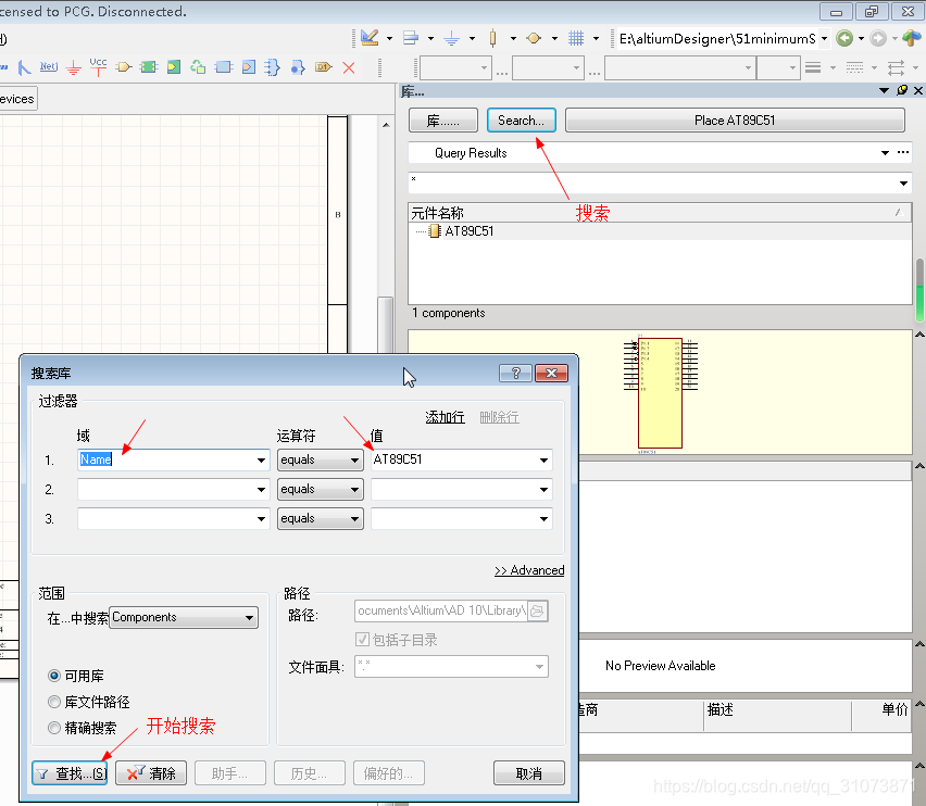 3、查找上一小节建立好的原理图库。(1)点击搜索,(2)按名称Name搜索,(3)名字为AT89C51(上一小节起的名字),(4)点击查找