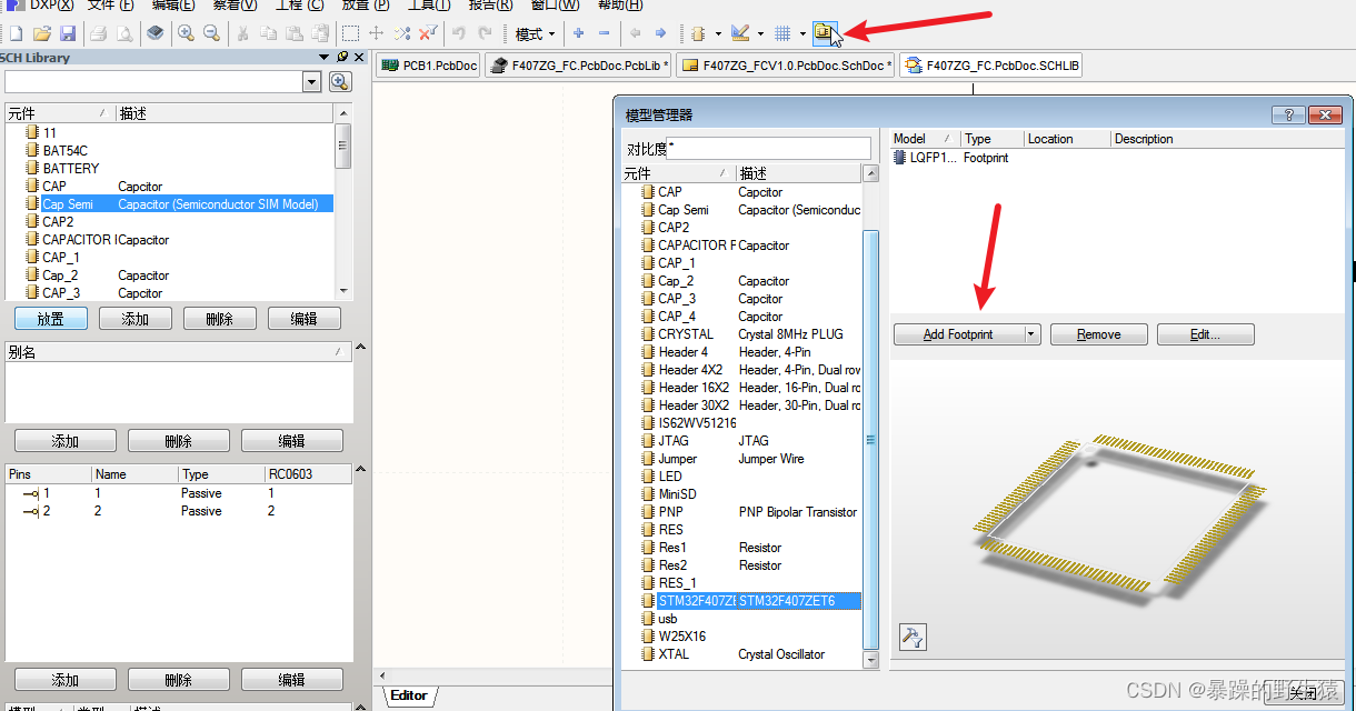 3、确认之后,我们就能在原理图库界面,看到其PCB封装预览:
