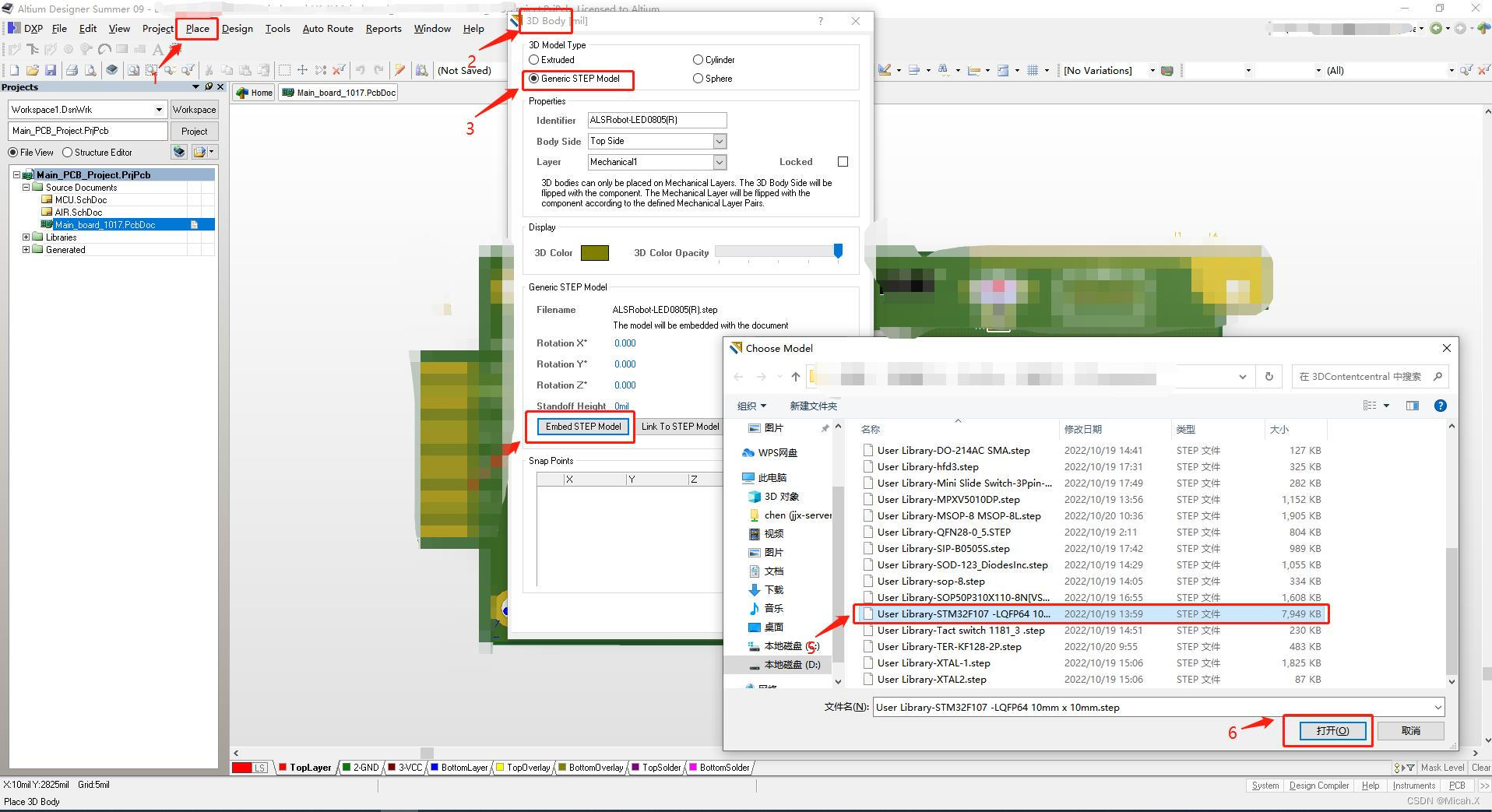回到AD,1. 菜单栏 选择“Place”→2.下拉列表中选择“3D Body”→3.点击选择“Generic STEP Model(通用STEP模型)”→4.点击“Embed STEP Model(嵌入STEP模型)”→5.选择元器件对应模型→6.打开→OK