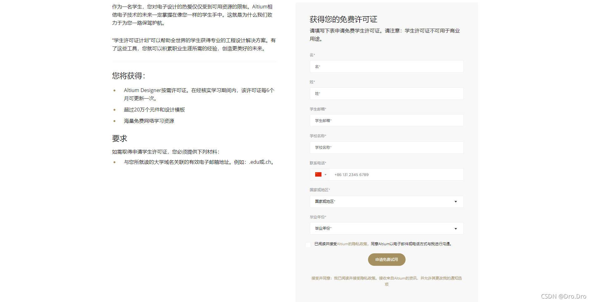 学生许可证 | Altium Academic作为一名学生,您对电子设计的热爱仅仅受到可用资源的限制。Altium相信电子技术的未来一定掌握在像您一样的学生手中。这就是为什么我们致力于为您一路保驾护航。 “学生许可证计划”可以帮助全世界的学生获得专业的工程设计解决方案。有了这些工具,您就可以积累职业生涯所需的经验,创造更美好的未来。https://www.altium.com.cn/solutions/academic-programs/student-licenses        进去后应该是这样的