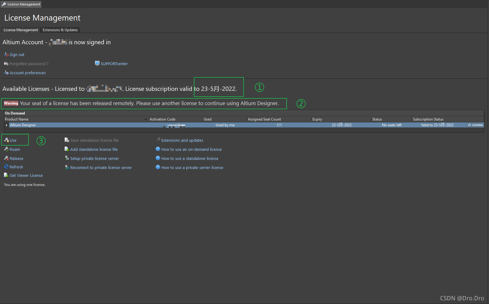 上面框了几个地方,其中③处表示Use按钮在哪,①处表示能使用的时间,好像每过六个月要去激活一次,②显示的才是激活license使用成功了。