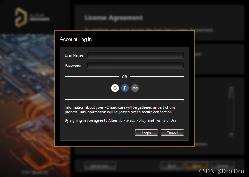 在线安装包从邮箱中的链接下载即可,软件不大,但是在安装的时候一定要联网,因为是在线安装的,而且在安装中需要登录AltiumLive账号(如下图所示),即之前激活的AltiumLive账号,登录即可继续后面的安装过程,然后正常安装即可。