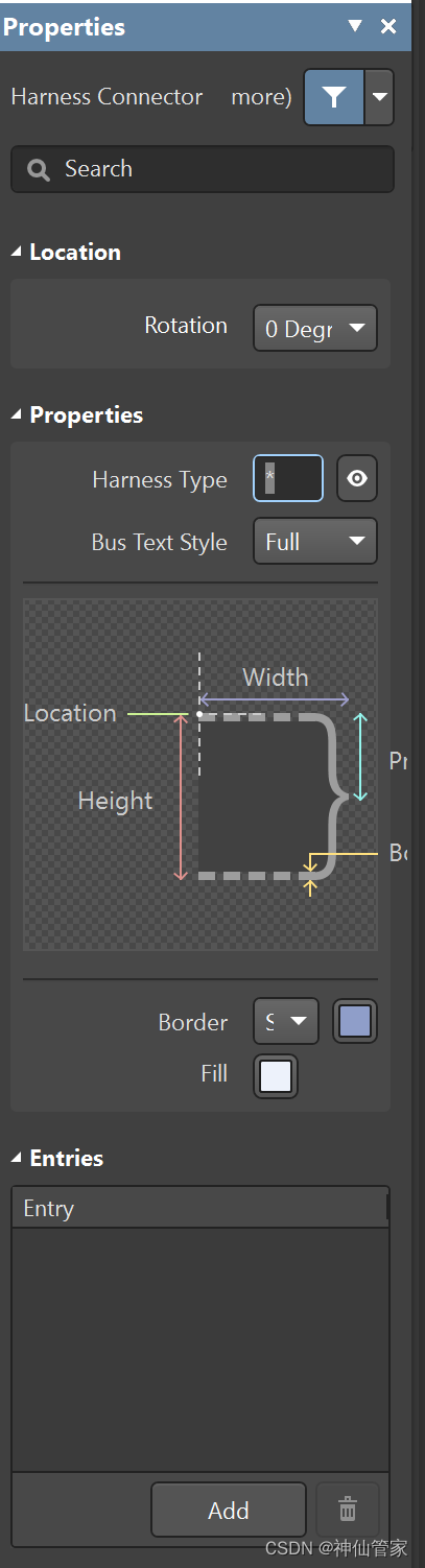(3)设置线束入口的属性。放置连接器的过程中,用户可以自行对线束入口属性进行设置。双击线束入口或在光标处放置线束入口状态时按<Tab>,弹出的“Properties”(属性)界面.