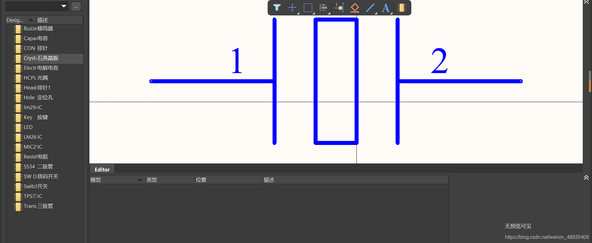 建立一个原理图库,自己添加并绘制各种元器件,比如一个晶振。再在绘制原理图时进行调用,就好了。但这样确实有点麻烦,如果自己不想画器件,AD里也是有库可以调用的。