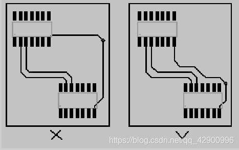 - 双面板两面的导线应互相垂直、斜交或者弯曲走线,尽量避免平行走线,减小寄生耦合等。