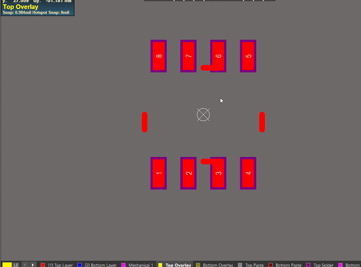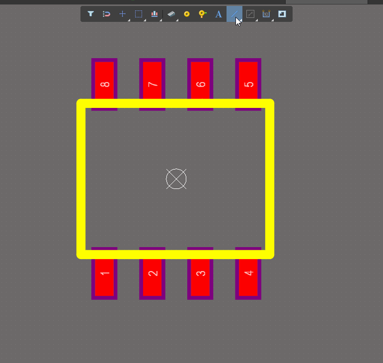 (4)丝印的绘制方法如下图所示,按快捷键P,在再按L,便可以开始绘制丝印,在绘制边框时,先在四条边上绘制四条小线段,在中心点处绘制后选中,使用快捷键M,设置偏移距离,若中心点不在两个焊盘中心,可在编辑菜单中,选择参考,再选择中心就可以了,在绘制四条小线段的过程中,复制时以中心点为偏移量复制,然后 镜像 一下再粘贴,绘制完四条小线段后,按P、L继续绘制完整的边框,在此过程中,需要切换绘制方式,在美式键盘下,按快捷键Shift+空格,可切换为下图所示的直角轨迹(注意:在中式键盘下此快捷键无效)