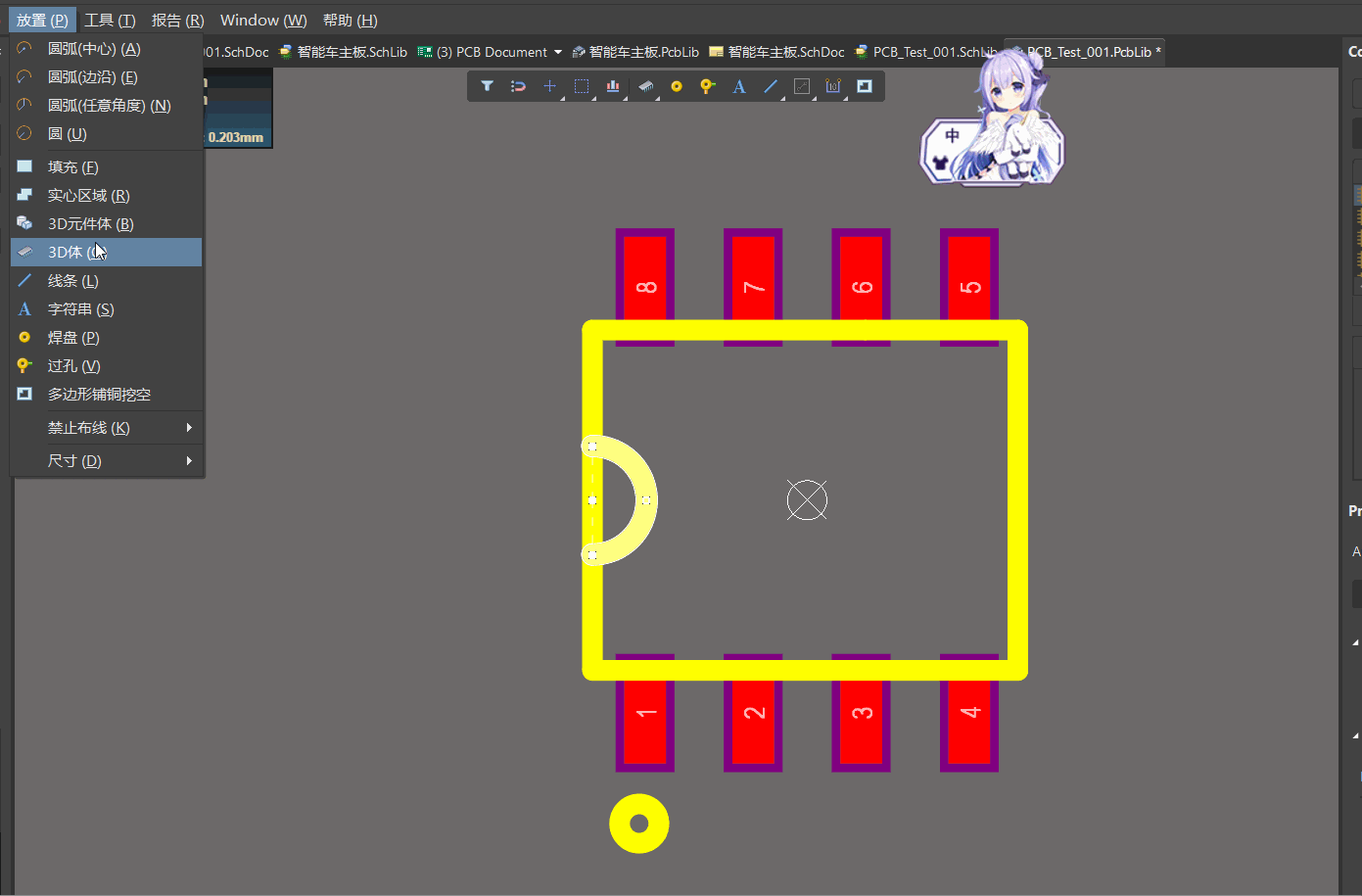 (2)在放置菜单里选择3D 元件体开始创建,按快捷键P、B开始绘制,按快捷键Tab暂停,选择层数(一般为1层),按照元件规格书的参数设定实物高度,后按enter进行绘制,绘制完成后,按快捷键ctrl+D,可以选择3D视图,按住shift+右键可以进行旋转查看