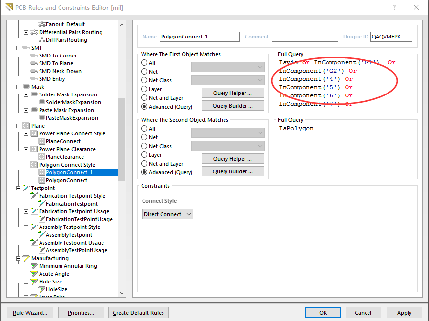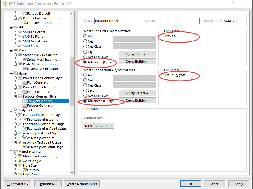 在Polygon ConnectStyle中创建新的规则,命令软件在铺铜是遇到过孔(IsVia)是使用直接完全连接(Direct Connect)的方式