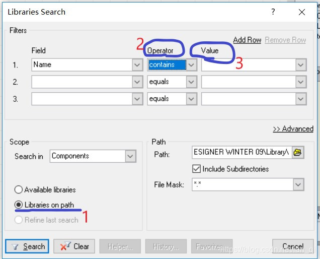 在 弹出窗口 中,1、修改搜索范围为”Libraries on path";2、将“operator”改为“contain”;3、在“value”栏输入名字部分。如下图