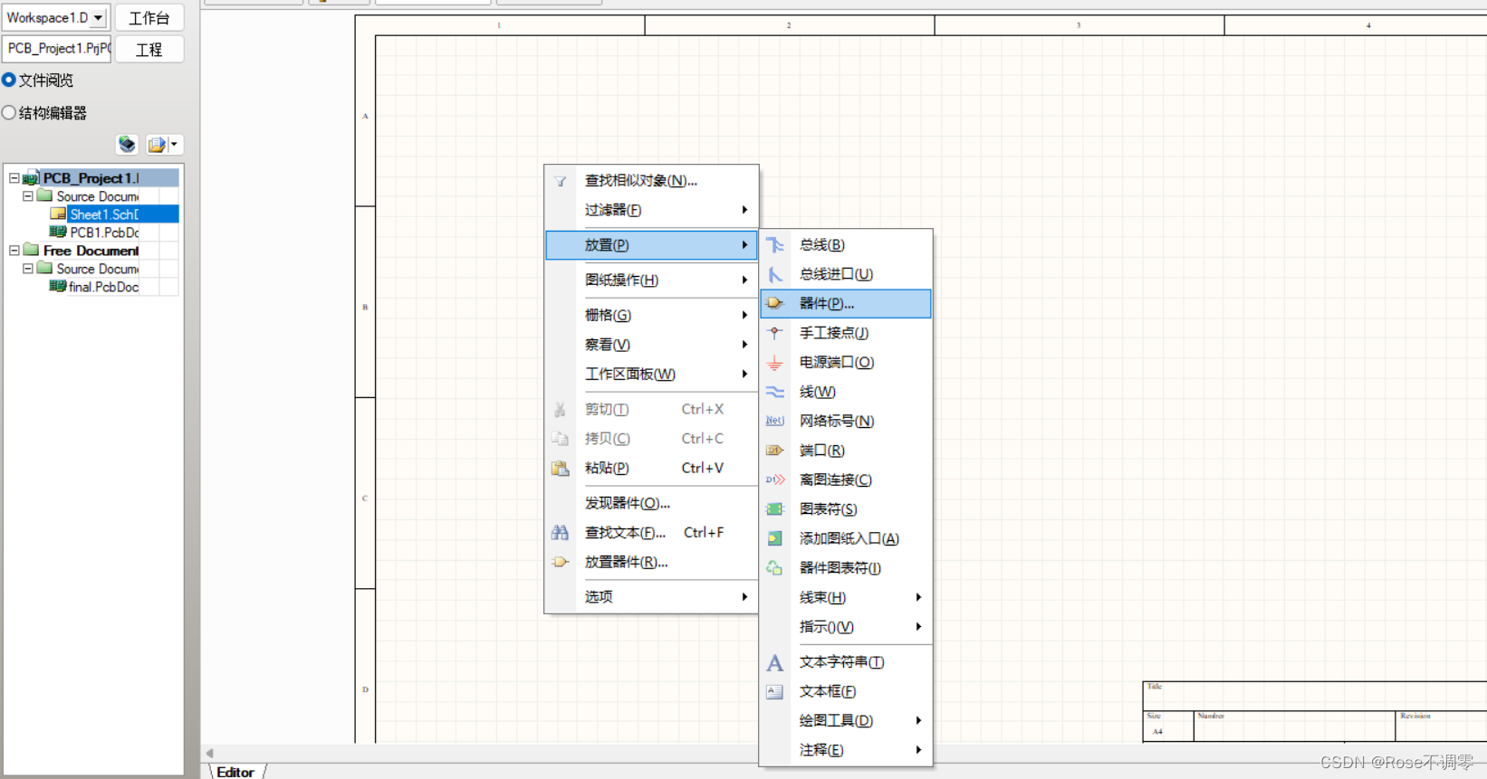 在完成原理图文件的创建之后,进入原理图页面,接下来就是就是元件的放置,有两种方式,首先是点击鼠标右键,如下图所示,在放置中找到器件选项,点击器件。