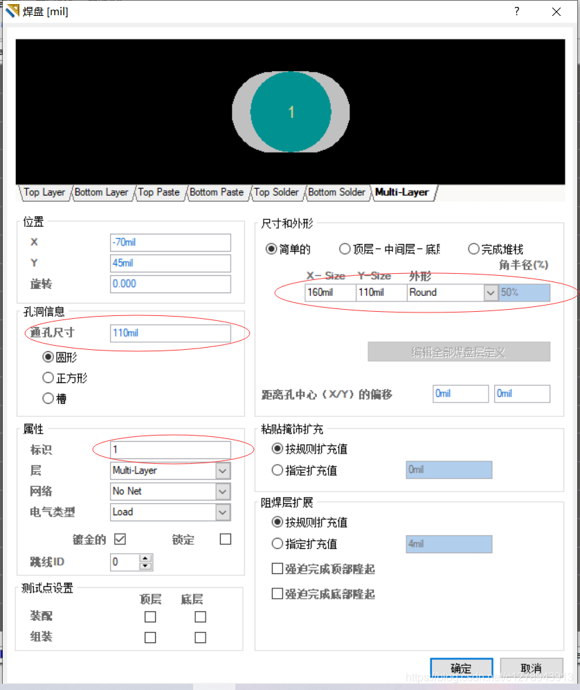 设置焊盘参数:焊盘通孔直径略大于管脚直径,设置为110mil=0.11in。焊盘有形状有圆形,椭圆形(在保持焊盘之间距离不变的情况下,在另一方向增加焊接面),长方形(一般用来表示第一管脚)。焊盘大于孔径,设置焊盘为椭圆形,X=160mil,Y=130mil。
