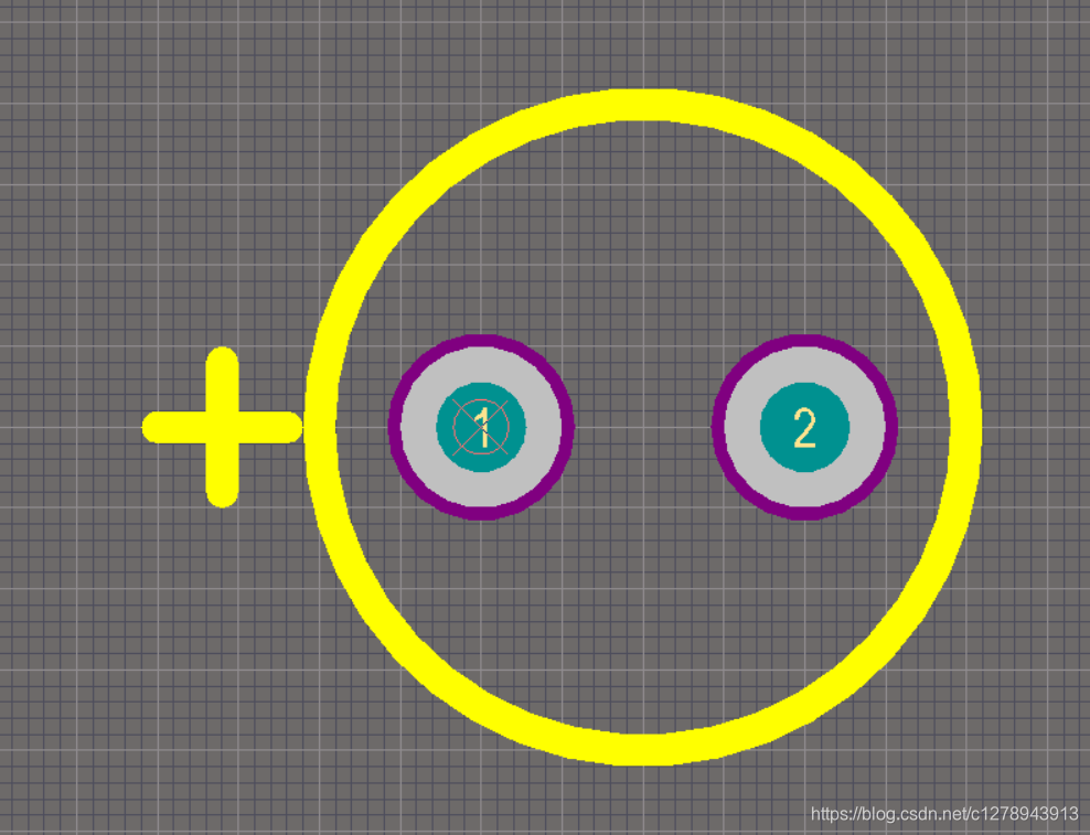 9)对于创建的封装与实际不一致的地方,进行手工修改,如将正极的符号“+”移至焊盘1附近。