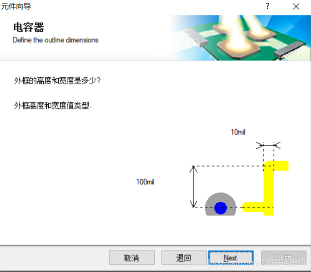 6) 单击“Next(下一步)”按钮,弹出“Define the outline dimensions(定义外框线尺寸)”对话框。将轮廓线外圆半径值改为100mil,外框线宽度仍采用默认值10mil