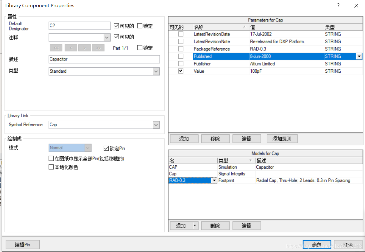 单击“Edit(编辑)”按钮,弹出库元件属性对话框。