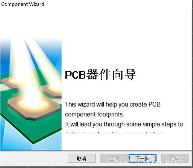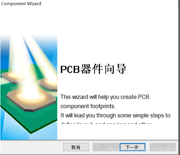 2)执行菜单命令“Tools(工具)”》》“Component Wizard(元器件向导)”,弹出“Component Wizard(元器件向导)”对话框。单击"Next(下一步)"按钮弹出可供选择的封装 类 型对话框。
