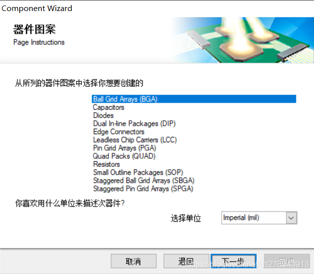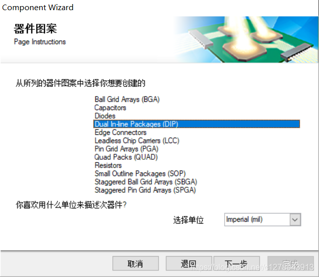 3)创建DIP封装,选择Dual in-line Package(DIP)的封装类型,并在"Select a unit(选择单位)"中选择Imperial(英制),另一个选择为Metric(公制)。