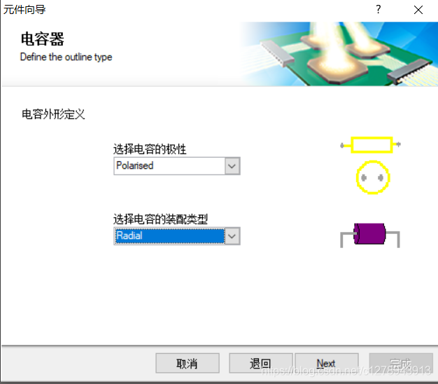5)单击“Next(下一步)”按钮,弹出“Define the outline type(定义外框类型)”对话框。制作有极性的电解电容或发光二极管,在“Choose the capacitor‘s polarity(选择电容器极性)”中选择“Polarised(有极性的)”;制作无极性的电解电容或发光二极管,在“Choose the capacitor‘s polarity(选择电容器极性)”中选择“Not Polarised(无极性)”;在“Choose the capacitor’s mounting style(选择电容器装配方式)”中选择“Radial(放射状)”。