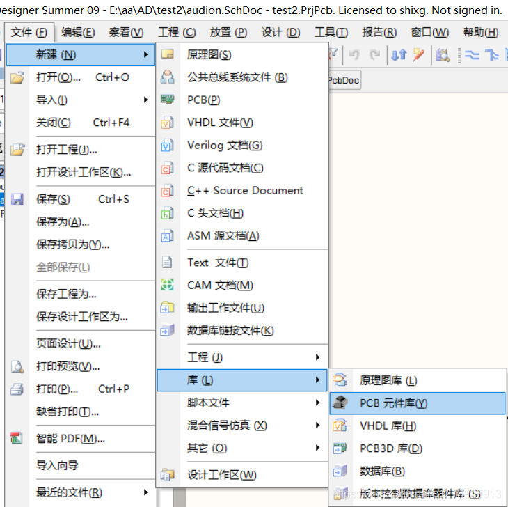 1)执行菜单命令“File(文件)”》》“New(新建)”》》“Library(库)”》》"PCB Library(PCB库)".新建PCB封装库