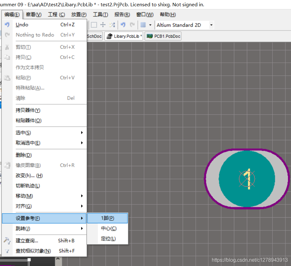 9)执行菜单命令“Edit(编辑)”》》“Set Reference(设置参考)”,设置参考点,一般以Pin1(1脚)或center(中心)作为参考点,最后保存。