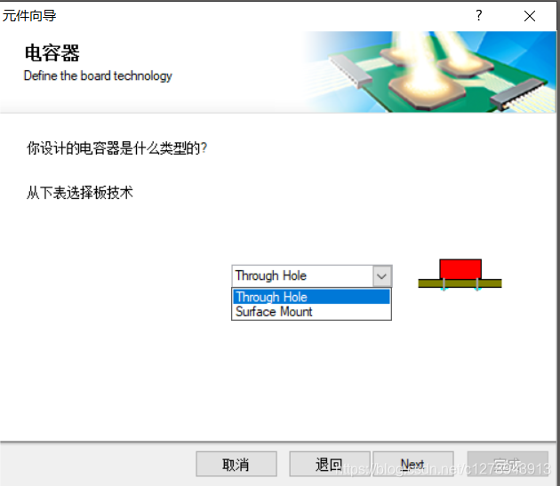 3)单击“Next(下一步)”按钮,弹出设置“type of capacitor(电容器类型)”对话框。因为要制作直插式封装,则选择Through Hole(穿孔式);如果制作贴片式封装,则选择Surface Mount(贴片式)。