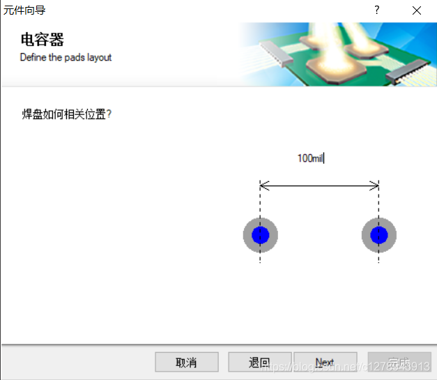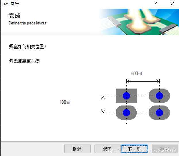 单击“Next(下一步)”按钮,弹出“Define the pads layout(定义焊盘布局)”对话框。将焊盘间距改为100mil;
