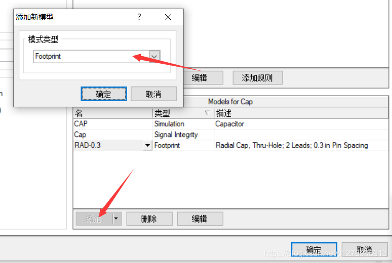 在“Models”项中给该元件添加封装,单击“ Add (添加)”按钮,弹出“Add New Model”(添加新模型)对话框,选择“Footprint(封装)”,单击OK(确认)按键.