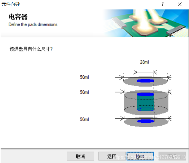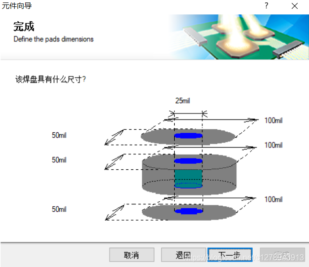 4)单击“Next(下一步)”按钮,弹出“Define the pads dimensions(定义焊盘尺寸)”对话框。采用默认值;