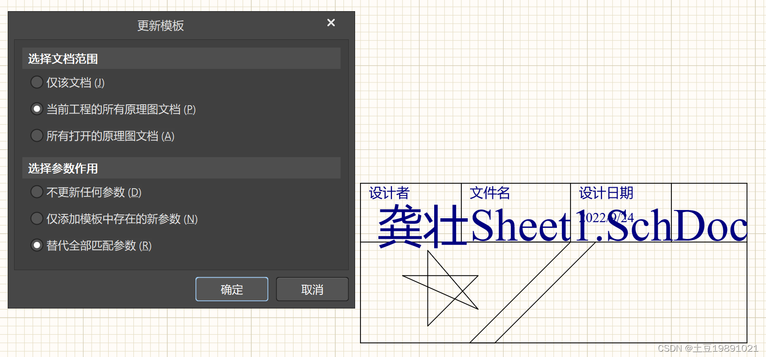 在图纸边框处双击鼠标右键,调出 对话框 。可设置,Template、Sheet size 及 title Block 有无 。