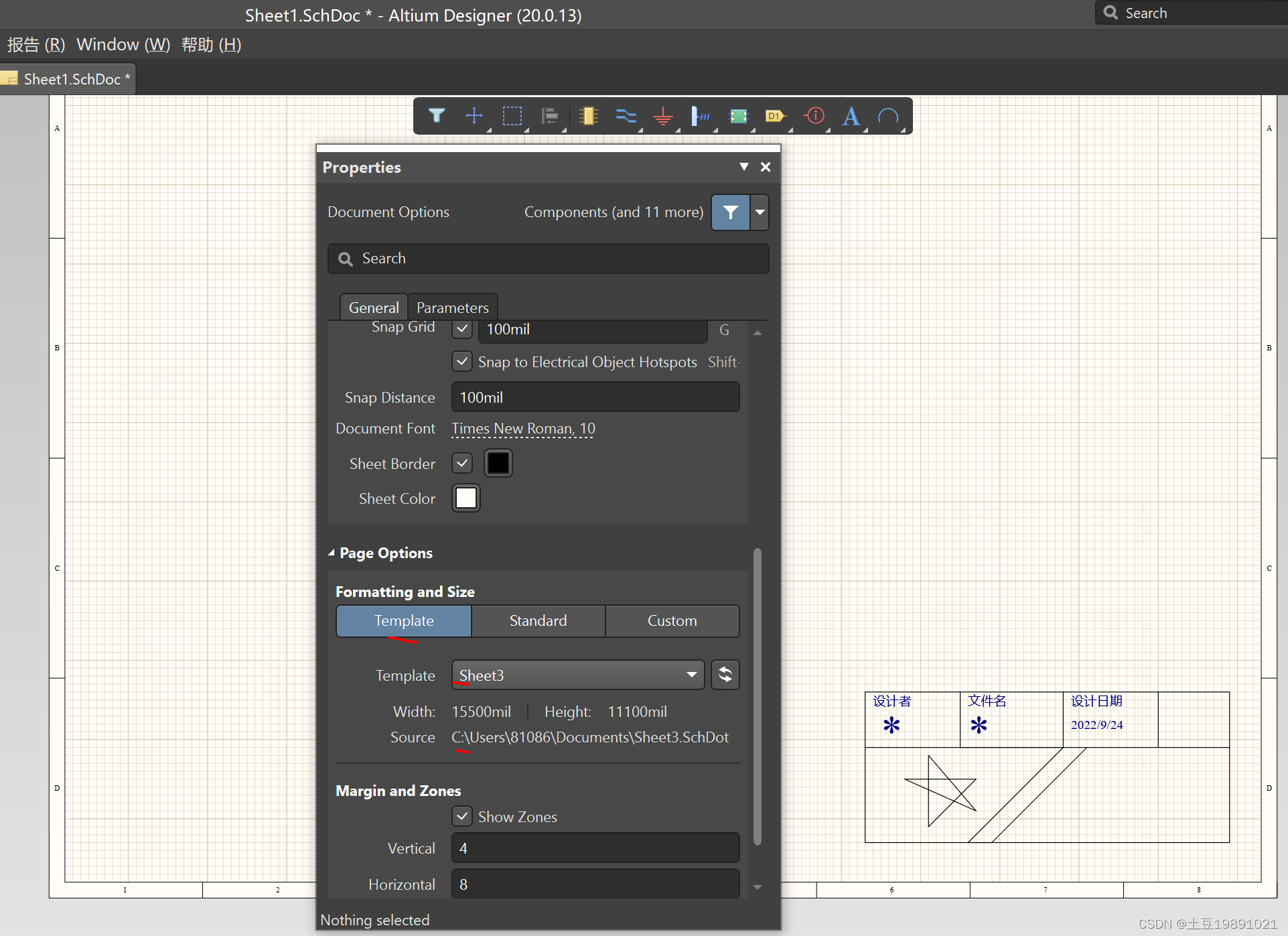 在新建的图纸边框处 双击鼠标左键 调出 Properties 面板(或通过 Panels 勾选上),,修改图纸模板即可