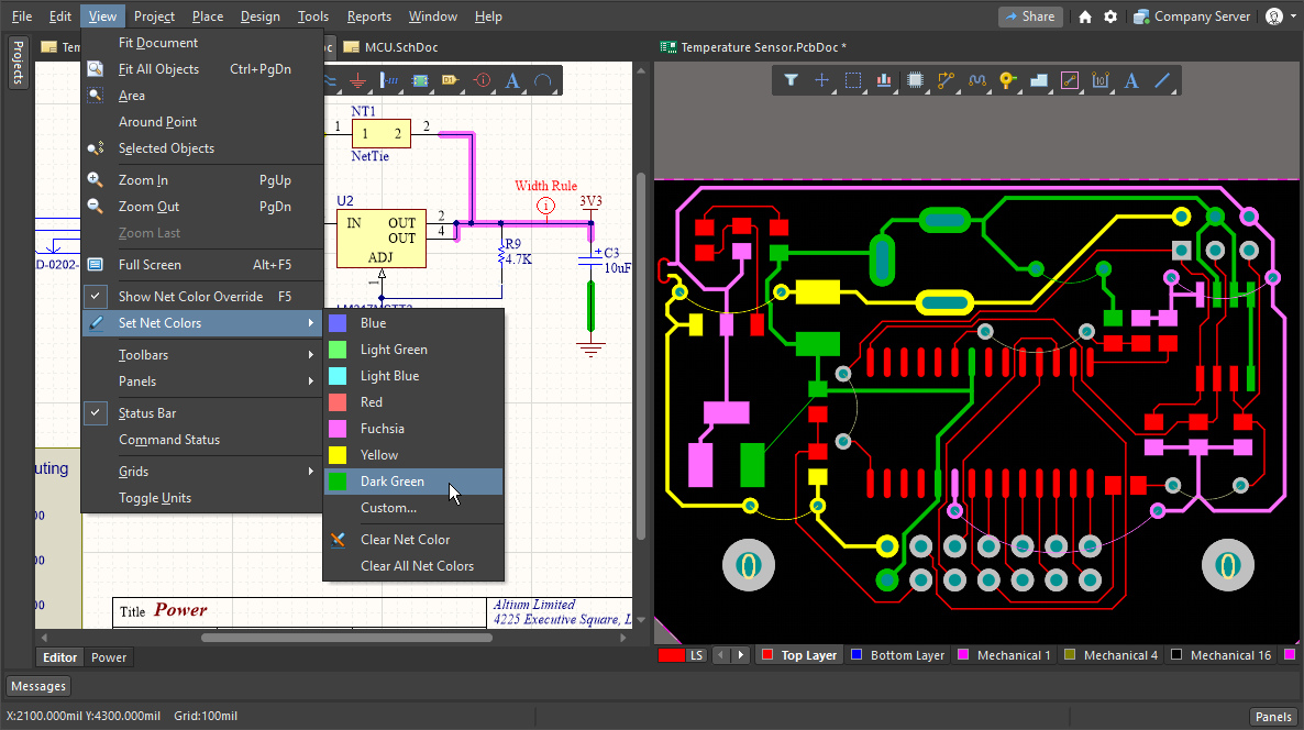 这项功能称为Net Color Override,能够根据需要更换指定网络的颜色。我们既可以从原理图把颜色配置传递到PCB,也可以直接从PCB编辑器里修改颜色。