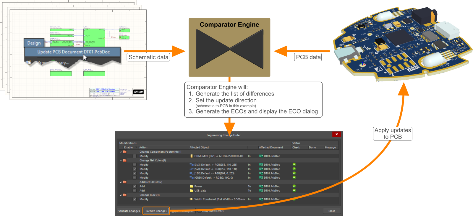 设计同步是直接在原理图和PCB之间发生的,不会再像过去那样生成类似于网络表之类的中间文档。软件会基于一个比较引擎来比较所有的设计内容,并针对差异项列出工程变更要求(Engineering Change Order,简写为ECO)。只要应用这些,二者就会再次同步。
