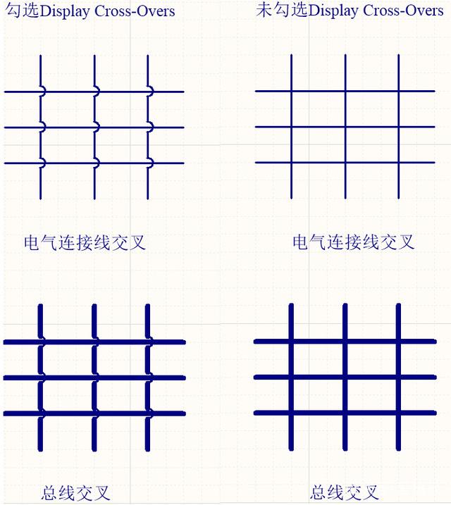 6. Display Cross-Overs:当两个电气连接线交叉,且为存在电气连接关系时,显示电气连接线的交叉未连接符号。