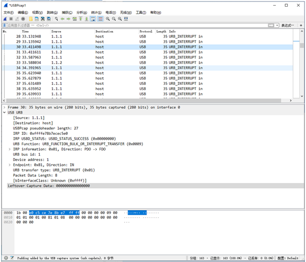 Wireshark 包含许多协议的解密支持,包括IPsec、ISAKMP、Kerberos、SNMPv3、SSL/TLS、WEP和WPA/WPA2。下面是 Wireshark 联合 USBpcap 驱动做得 USB 抓包示例。