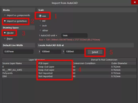 选择单位mm,这里的单位选择要与CAD单位一致,2导入后作为元素,3选择为模型,4位CAD中的所有层,可以在PCB Layer中选择是否导入,本次选择如图所是,5Select,点击后可以选择导入图形的原点。