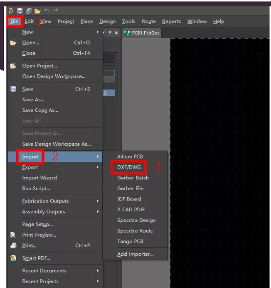 在AD09中点击File菜单下的Import,导入CAD文件