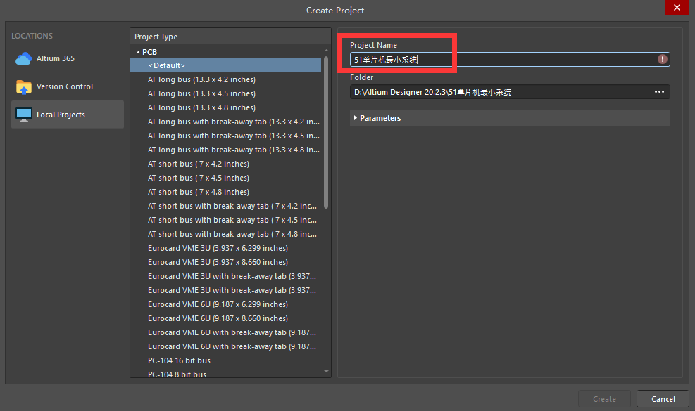2、创建工程文件:单击“文件”菜单,选择“新的”选项中的“项目”选项,在“Project Name”中将工程文件保存在自定义的文件夹中,并将文件命名为“51单片机最小系统”,点击“Create”进入工程文件的初始工作界面。