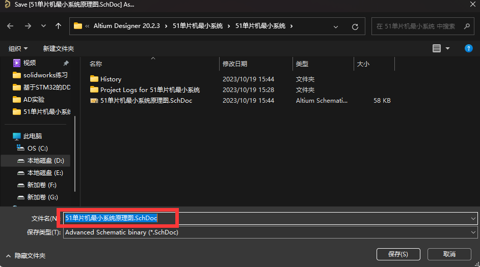 4、保存原理图文件:选择“文件”菜单,选择“保存”选项,将文件命名为“51 单片机  最小系统”并进行保存。