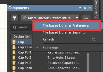 ”按钮,选择“File-based Libraries [ˈprɛfərənsɪz]Preferences…”选项,选择“已安装”选项卡,单击右下方的“安装”按钮打开元件库文件选择窗口,双击需要添加的元件库文件,元件库文件添加完成后单击“关闭”关闭窗口。