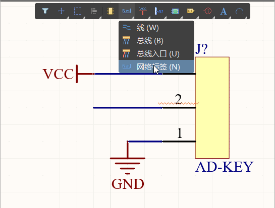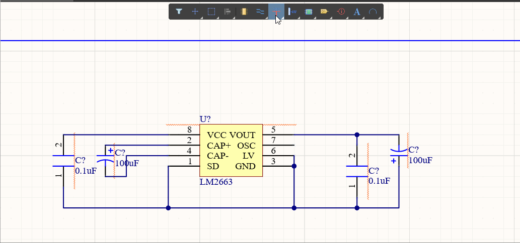 (1) 在上图的基础用导线对其进行连接,注意此处用的是导线,是有电气属性的线,不是绘图线,使用ctrl+W快捷键可以使用导线进行连接,或者在放置菜单里找到线,点击后进行连接,如下图所示: