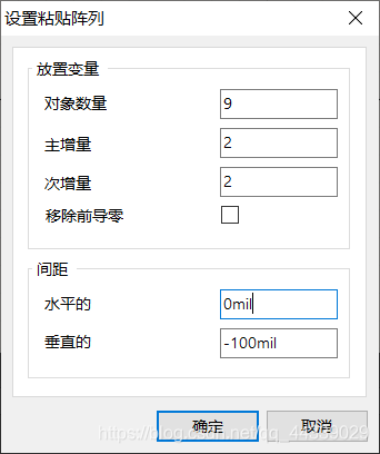 (1) 由于排针类原件引脚数一般较多,一个个放较繁琐,可先放第一个引脚,然后选中第一个管脚Ctrl+C复制一下,然后在编辑菜单里找到阵列式粘贴,打开,如下图所示,间距处改变正负号可以改变数字叠加的方向,由于我们的栅格间距设置的是100mil,此处间距大小也设为100mil,此外主增量是引脚号依次叠加的数量,次增量是引脚名称依次增加的数量,左侧操作完后,同理可把右侧也添加完,如下图所示:
