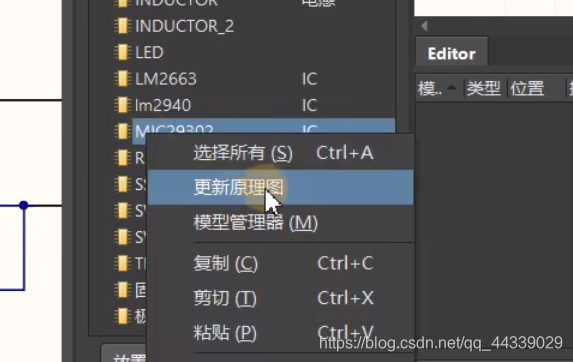 (4)若在连线过程中发现某些引脚对不上,可以返回元件库进行检查,若发现错误改正后,可在元件库中,单机右键,更新原理图,这样在原理图中的元件就自动更正了