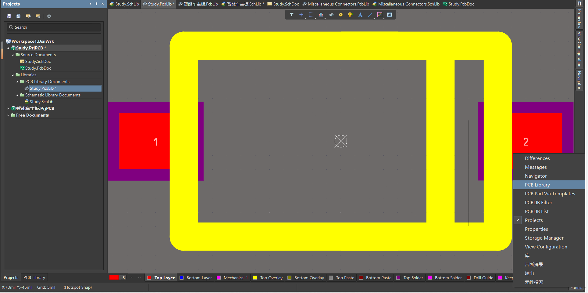 画丝印层的封装,先选丝印层 Top Overlay 再画一段线,然后选中,【M】 选择【通过X/Y移动选中对象】,复制的那个中心点,一般都选择原点 另外一边可以使用镜像操作,X或Y 效果图: 参考文章:http://t.csdnimg.cn/T6ykf 连线 连线完成,将其中的小短辅助线删除掉,从左上角到右下角选择 画完封装,最后修改引脚号