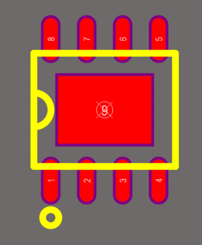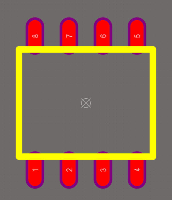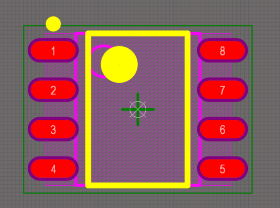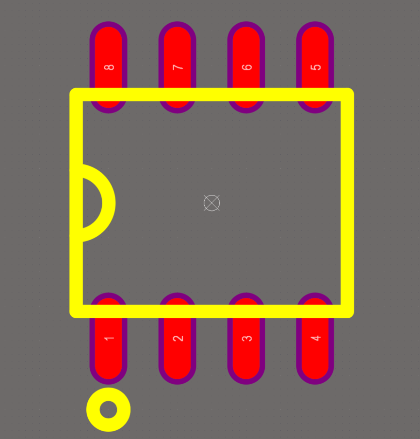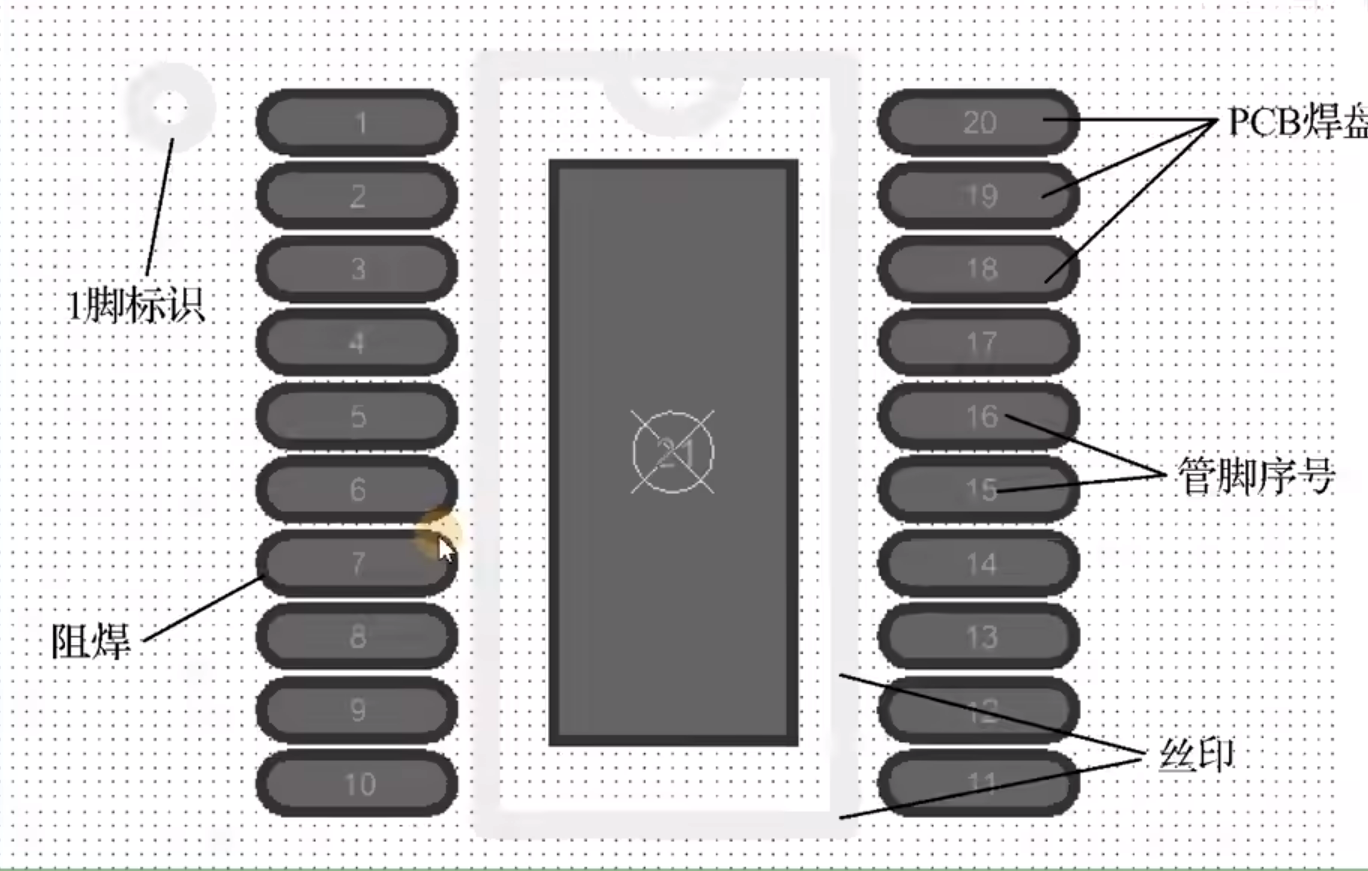 PCB焊盘,焊接器件用的。 管脚序号,和原理图管脚一一对应。 丝印,是实物本体的大小范围。 1脚标识,定位器件的正反方向。 阻焊,防绿油覆盖的,把铜露出来,画图时的紫色部分就是阻焊。