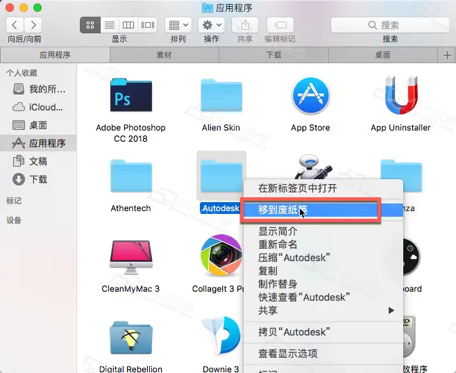 9.进入应用 程序 中,找到Autodesk右击“移到废纸篓”,如图:
