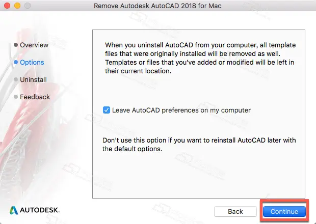 3.点击【Continue】继续卸载AutoCAD 2018 for Mac 破解版,如图: