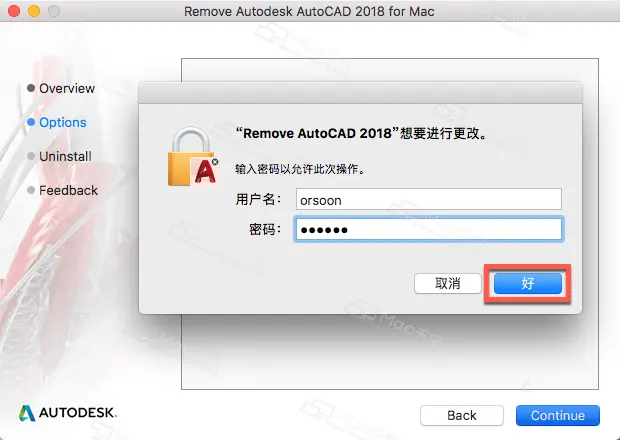 4.输入Mac密码后点击【好】,同意卸载AutoCAD 2018,如图: