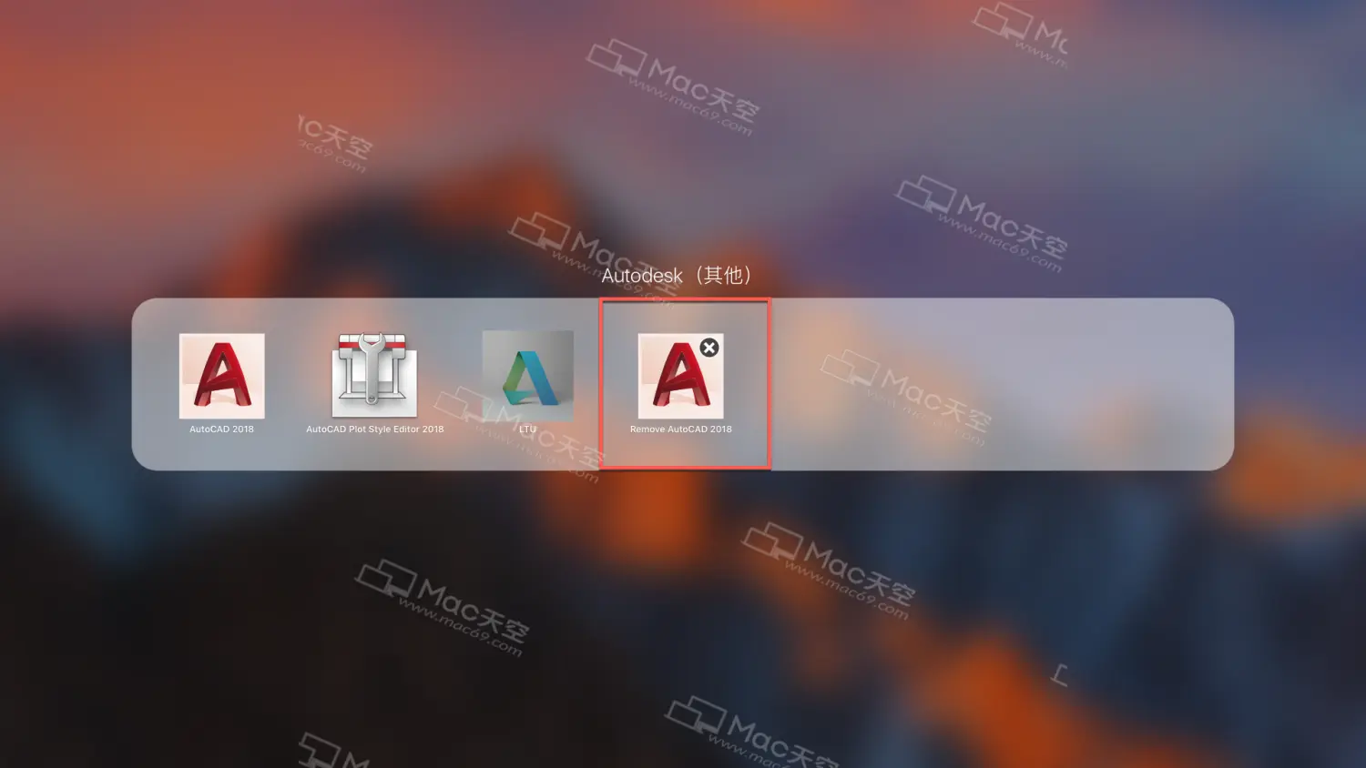 1.点击Launchpad进入软件菜单,点击“Remove AutoCAD 2018”软件自带卸载器,如图: