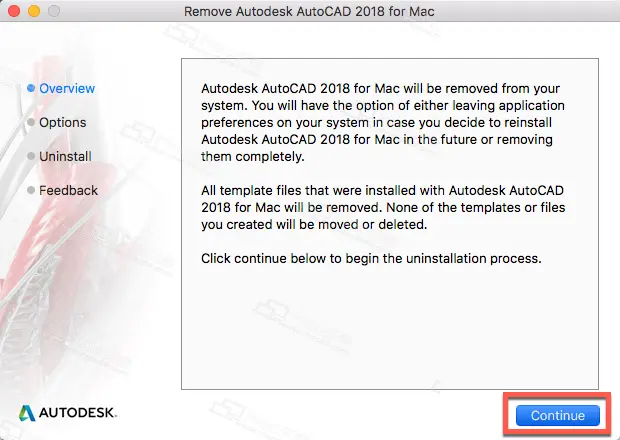 2.点击【Continue】继续卸载AutoCAD 2018 for Mac 破解版,如图:
