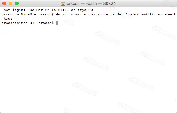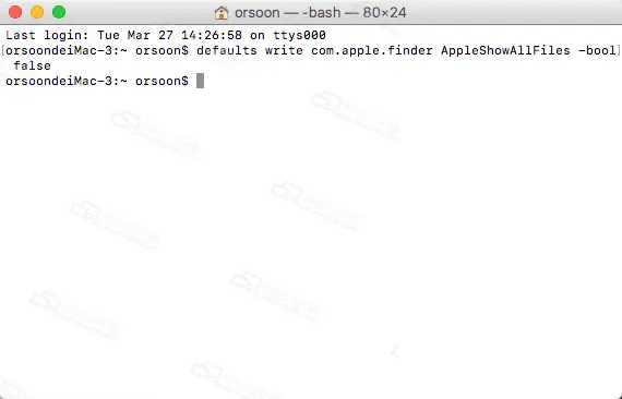 5.关闭终端:将括号内关闭显示隐藏文件夹命令复制入终端,点击回车键,如图:(defaults write com.apple.finder AppleShowAllFiles -bool false)