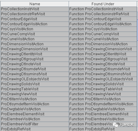 Visit函数用来访问数据对象内的一组 数据集 合,如访问CREO零件模型的特征。这类函数的输入参数通常是要被访问的数据对象以及访问的动作函数和过滤函数。所谓的访问过滤函数就是在访问的过程中对数据进行过滤,把不满足条件的对象去除掉;访问动作函数对经过滤的对象进行处理。例如在访问模型特征时,可以设置过滤函数过滤掉那些隐含的特征和隐藏的特征(关于隐含特征和隐藏特征可以参看CREO的相关手册),留下那些没有被隐含的特征和隐藏的特征。动作函数只处理些 没有被过滤的对象,如获得某些特征的类型或者名称。